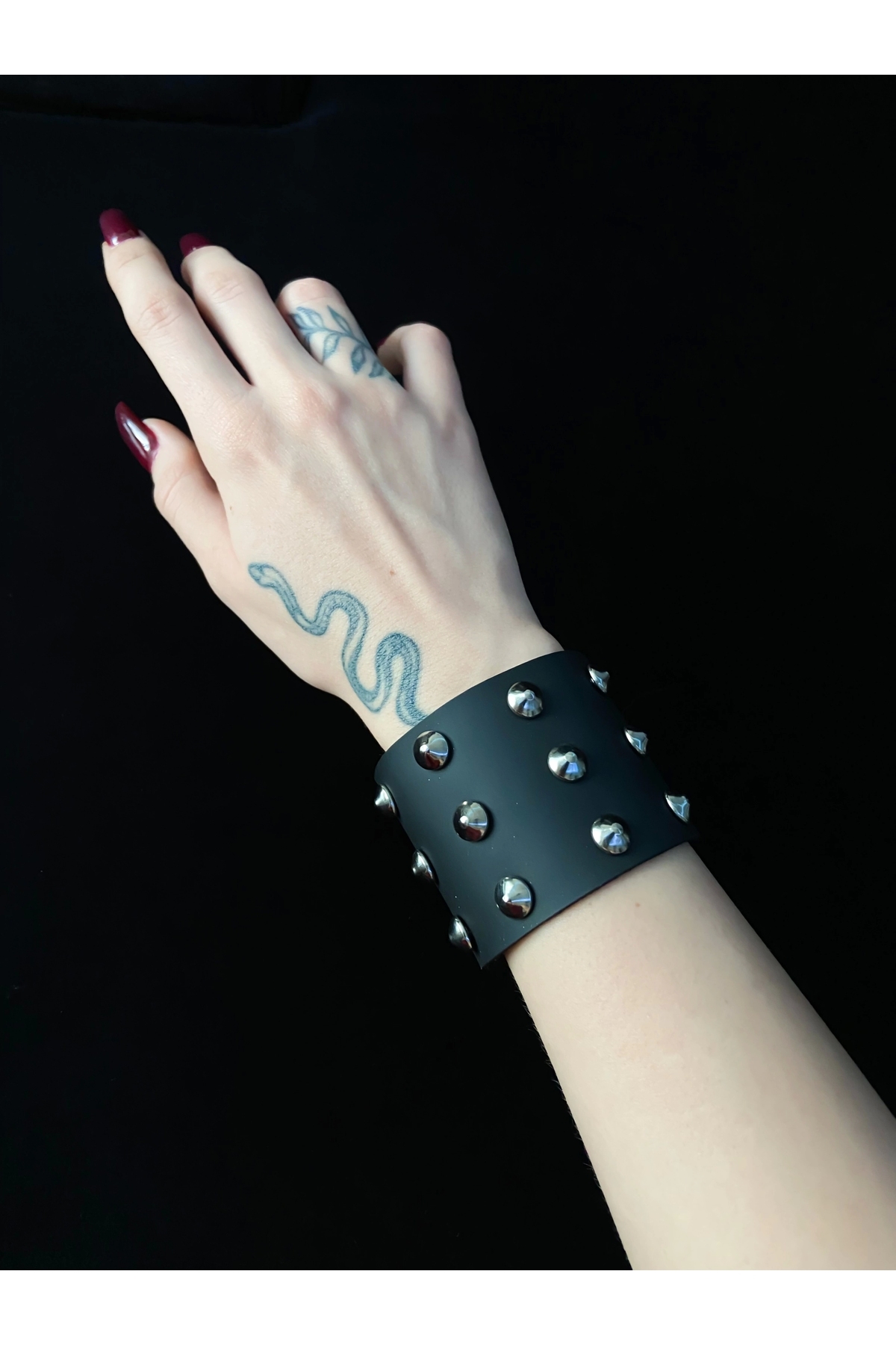 Ürün Suni Deriden Yapılmıştır.; Bileklik uzunluğu 22.5 cm'dir.; Bileklik Genişliği 5 cm'dir.; 18- 21 cm bilek ölçüsüne uyum sağlamaktadır.