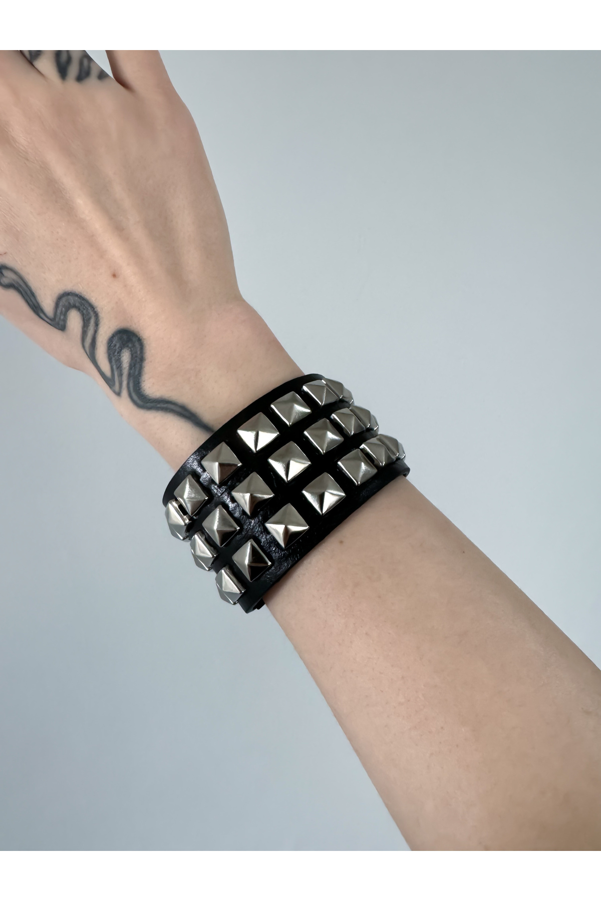 - Gotik ve punk tarzını yansıtan üç sıralı kare zımba detaylarıyla süslenmiş, şık ve modern bir aksesuar.; - Hem gençlerin hem de yetişkinlerin kullanımına uygun, unisex tasarımıyla herkes tarafından rahatlıkla tercih edilebilir.; - Yüksek kaliteli suni deriden üretilmiş olup, dayanıklılığı ve uzun ömürlü kullanımı garanti eder.;
