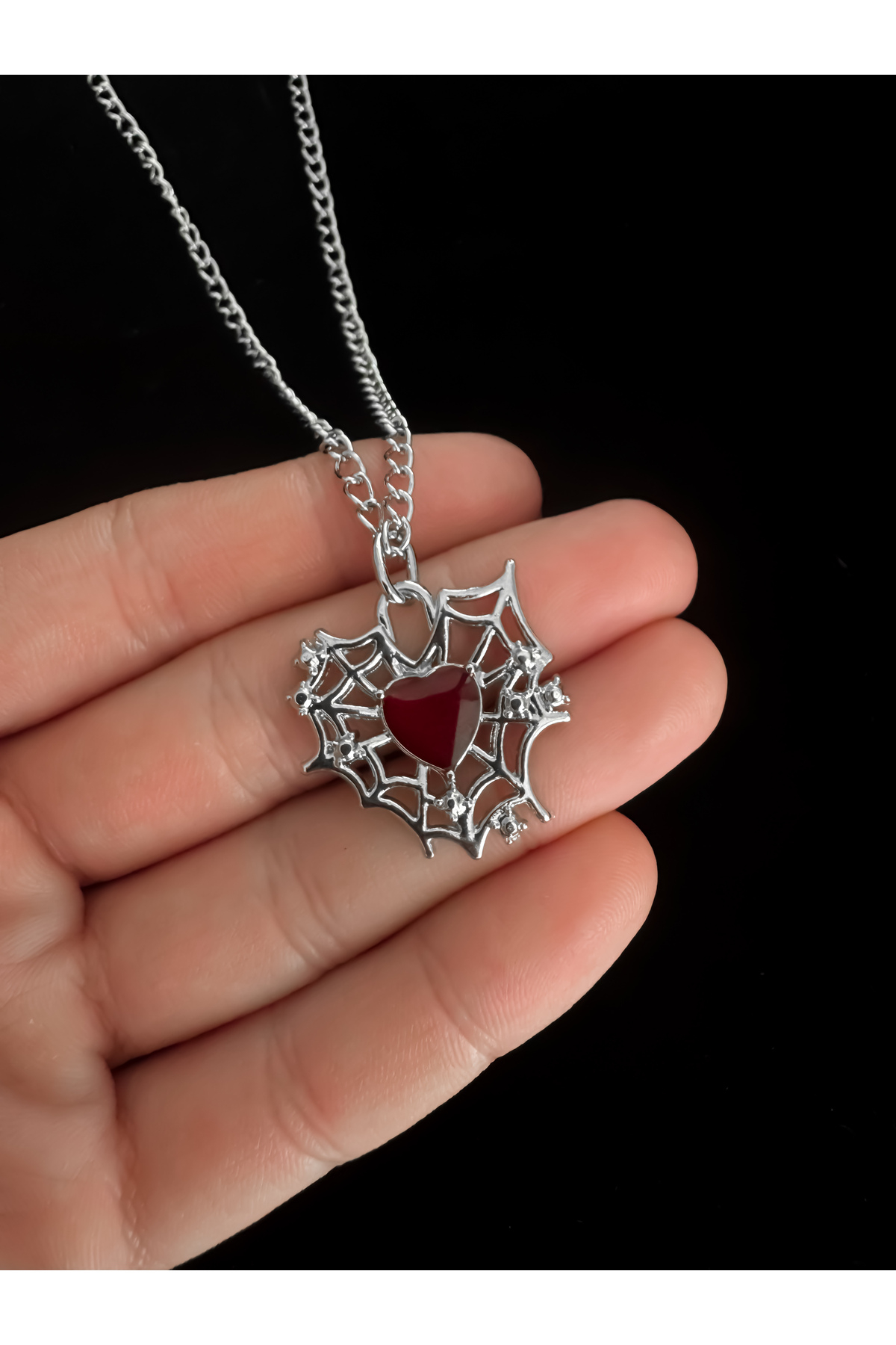 Gotik Gothic Punk Bordo Kalpli Ağ Kolye, Kalp Ağ Kolye
