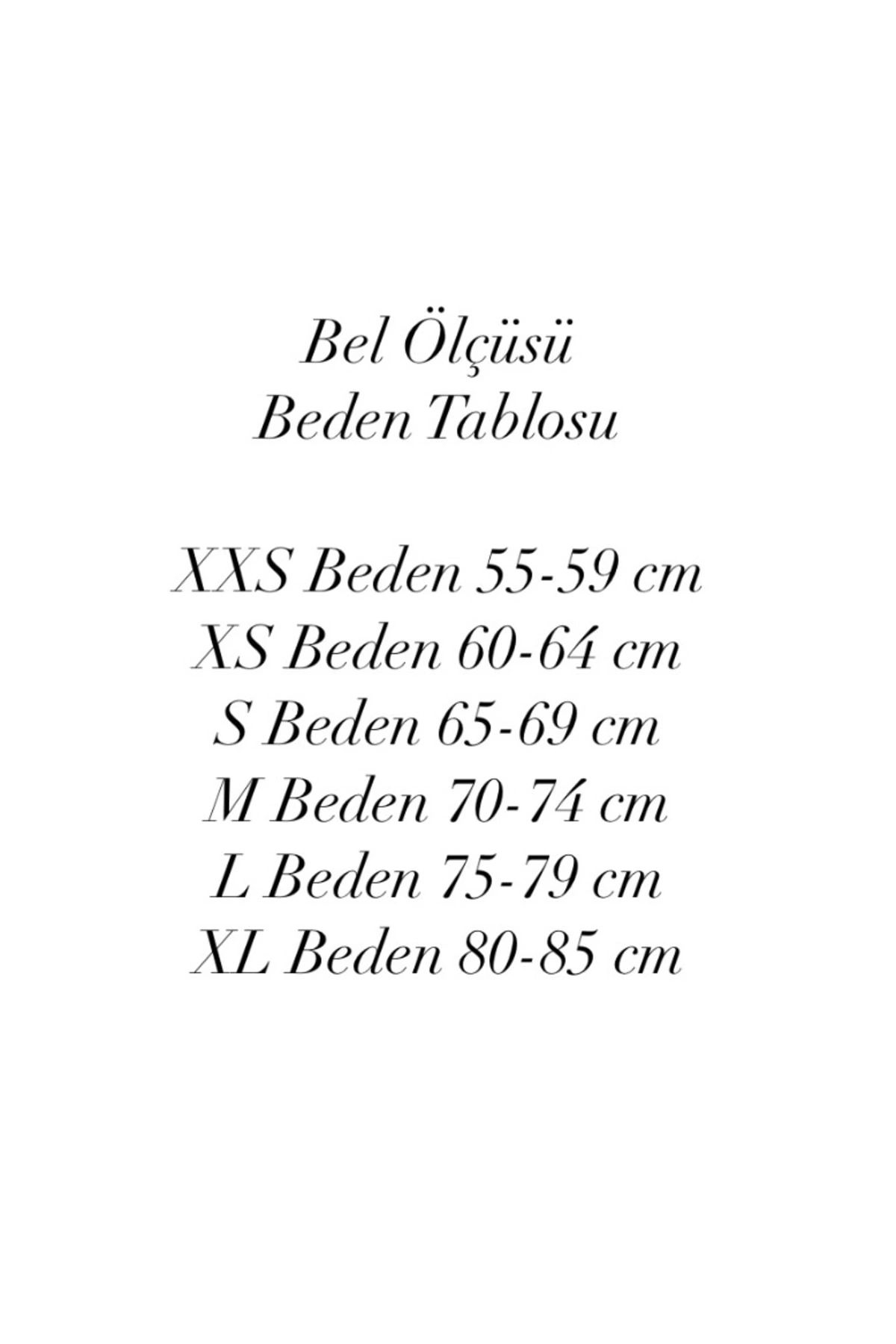 Beden ölçüleri XXS bel 54-59 cm, XS bel 60-64 cm, S bel 65-69 cm, M bel 70-74 cm, L bel 75-79 cm, XL bel 80-84 cm, Etek boyu 41 cm’dir.; Model üzerindeki beden XS bedendir.