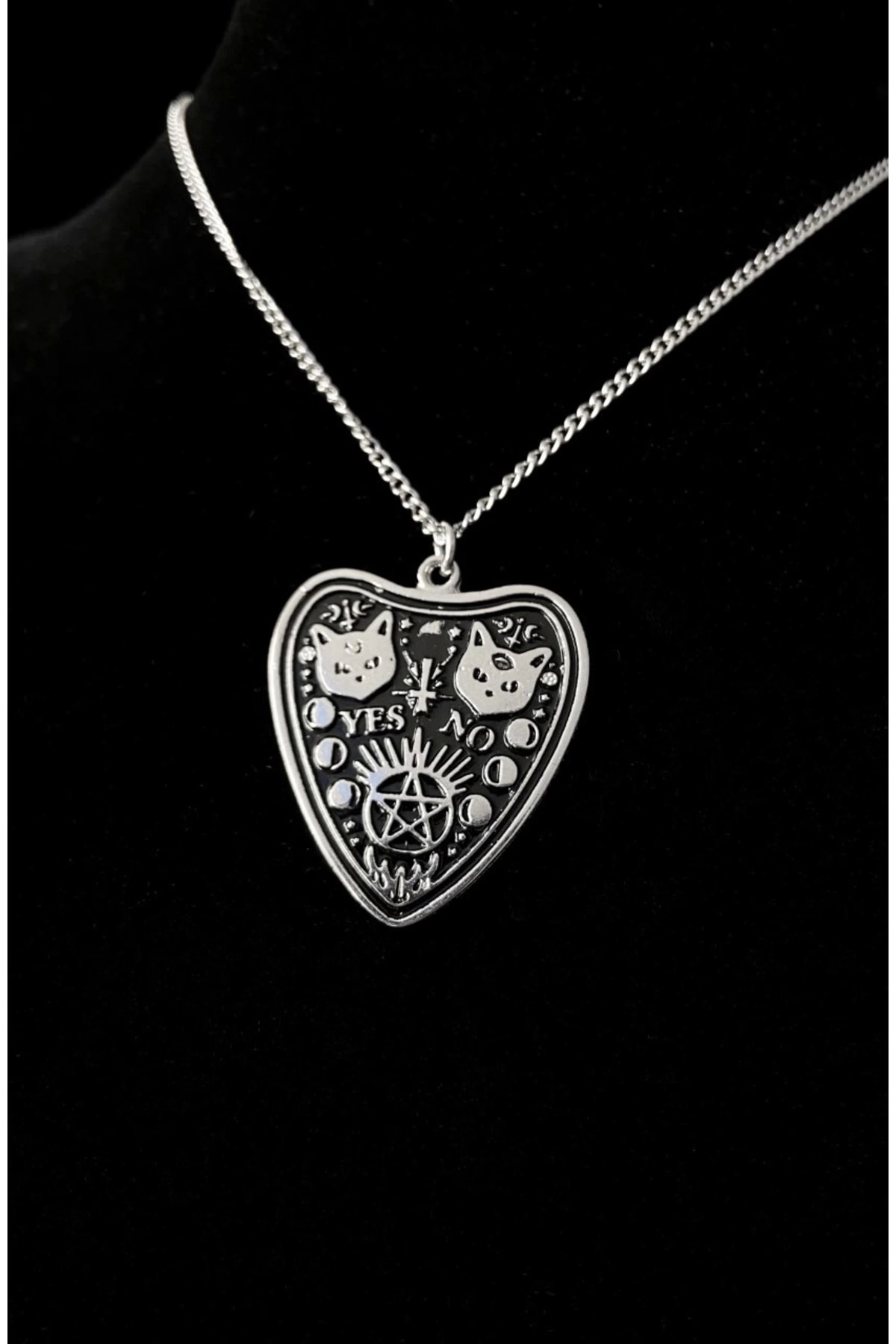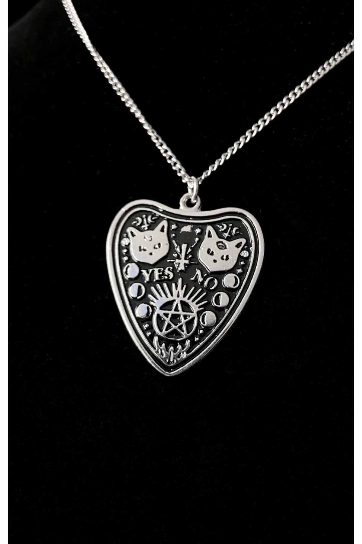 Gotik Punk Kedili Siyah Ouija Kolye ; Kolyenin Zincir uzunluğu 30 cm'dir.; İstenilen ölçüde kısaltılarak kullanılabilmektedir.; ; Materyal : Metal;