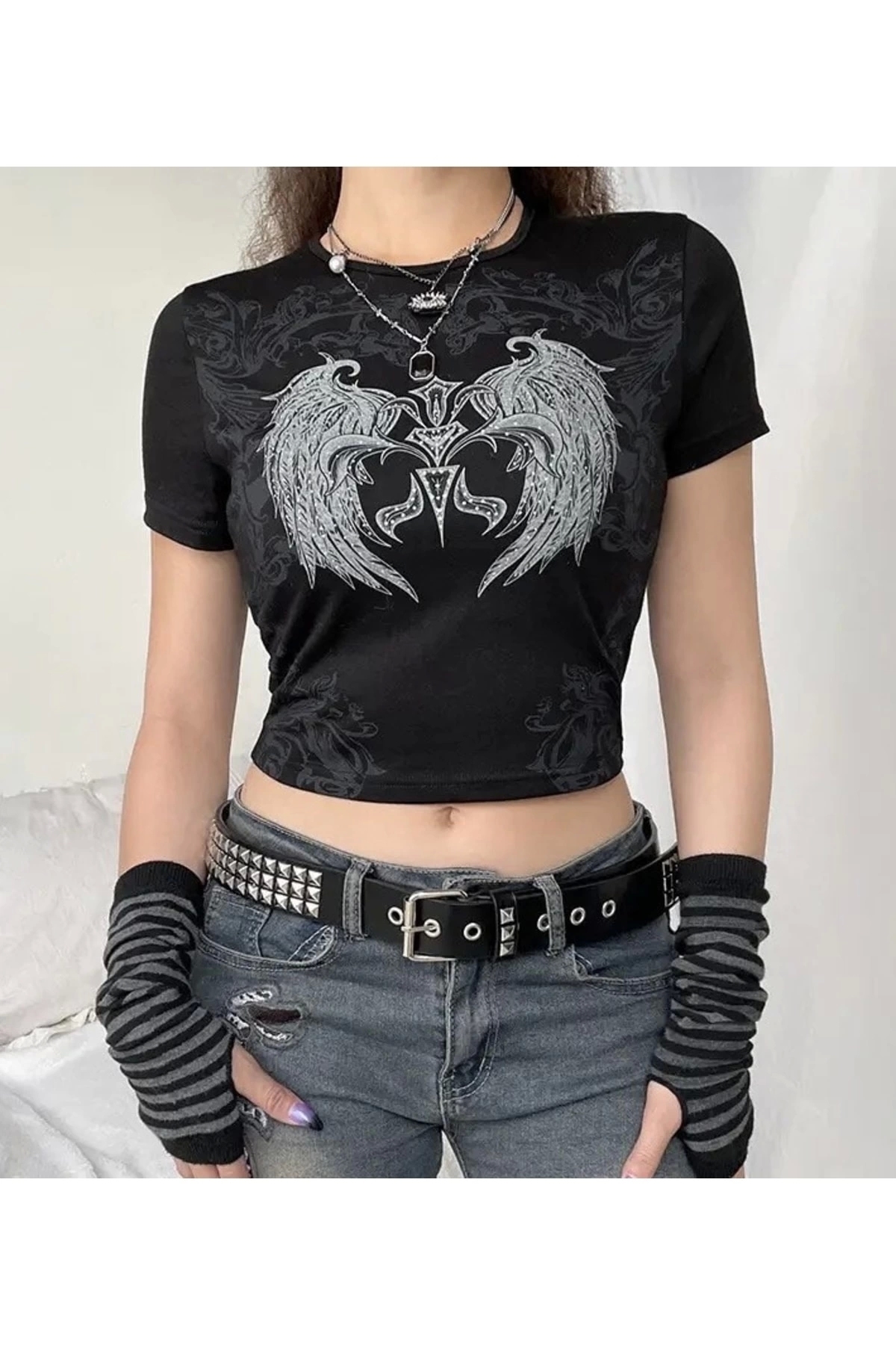 Gençlerin enerjisini ve stilini yansıtan gotik punk tasarımıyla dikkat çeken kısa kollu crop t; shirt, günlük kullanım için idealdir; Baskılı deseniyle dikkat çekici bir görünüm sunan bu t; shirt, gotik punk ruhunu her ortamda sergilemenizi sağlar; Pamuklu materyali sayesinde gün boyu konforlu bir kullanım sunarken, kısa kollu tasarımı ile yaz aylarında serinlik hissi verir; Crop kesimiyle modern ve şık bir siluet oluşturan bu t; shirt, bisiklet yakası ile rahat bir kullanım sağlar; Günlük ortamlarda rahatlıkla tercih edebileceğiniz bu ürün, gençlerin enerjisini ve stilini yansıtan gotik punk tasarımıyla öne çıkar;