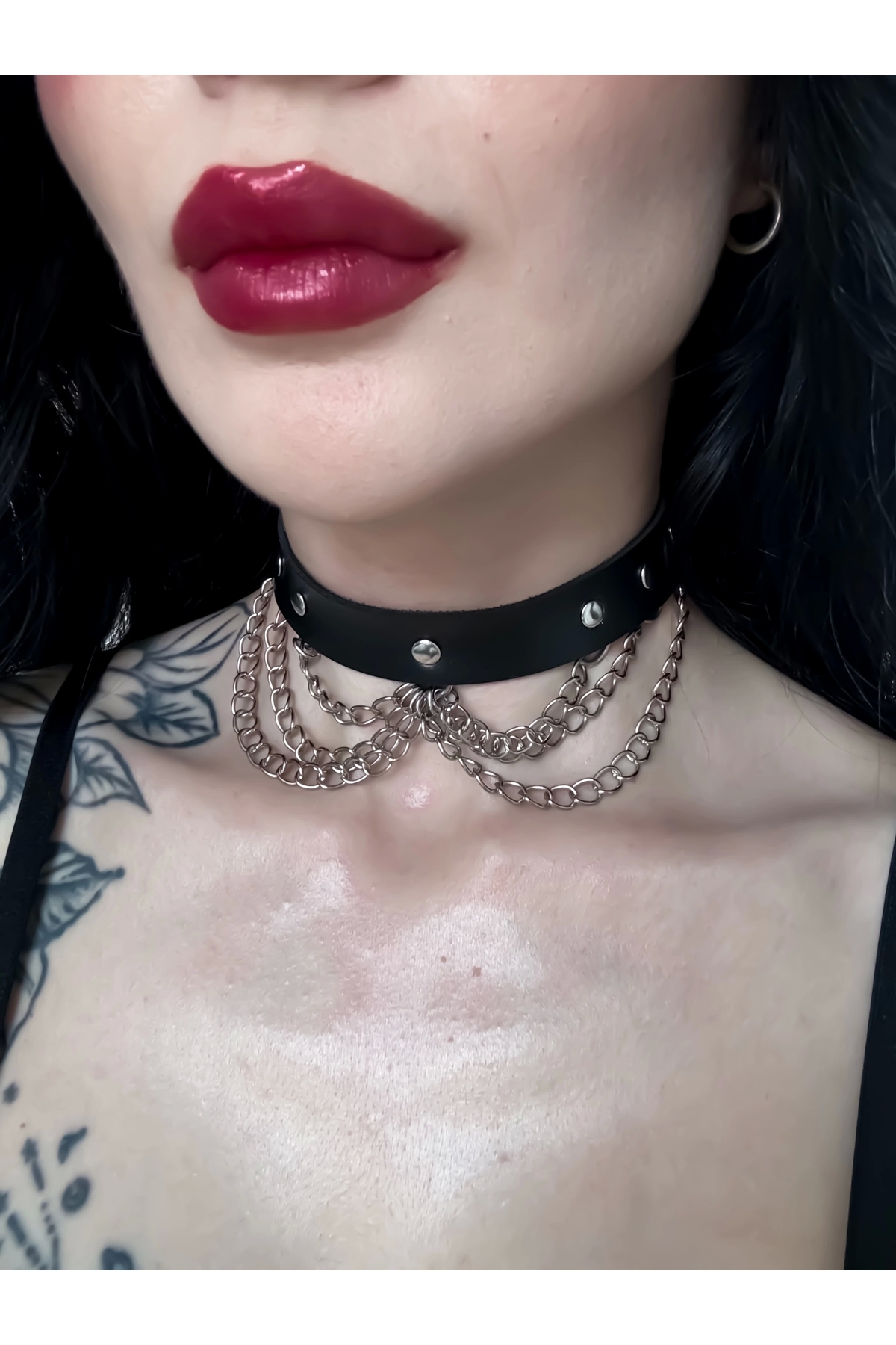 Gotik Punk Zincirli Zımbalı Suni Deri Choker Boyunluk (Ayarlanabilir)
